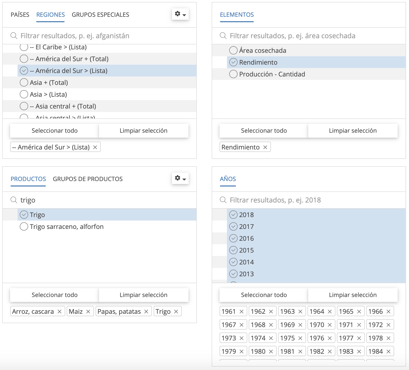elementospuede seleccionarÁrea cosechada(superficie cultivada),RendimientoyProducción. Para nuestro ejemplo elegimos rendimiento. - El siguiente paso es seleccionar los cultivos o