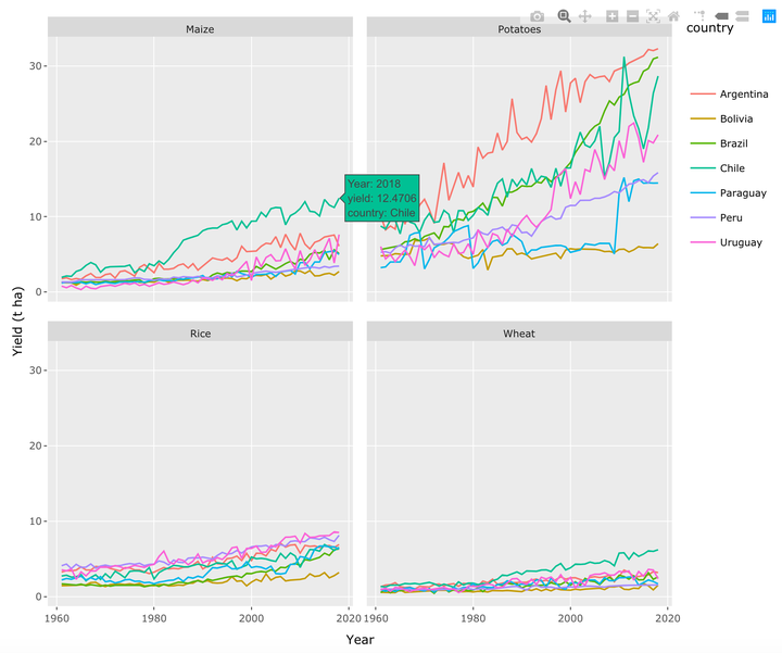 Para este proceso se identificó que la columna de Area contiene países de América del Sur; sin embargo, en estas obsevarciones Bolivia tiene texto adicional “Bolivia (Plurinational State of)”. Para eliminar el texto adicional se usa la función separate(Area, c("country"), sep = " "), el mismo proceso se aplica para Rice, paddy en la columa de cultivos Item. A partir de la columna Value se creó otra columna mutate(yield = Value / 10000), en la cual se hizo la conversión de hectogramos (hg ha-1) a toneladas (t ha-1). El siguiente paso fue seleccionar cuatro variables de la base de datos select(country, crop, Year, yield) y al finalizar este proceso se filtró los países más próximos a Bolivia.